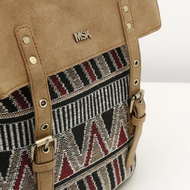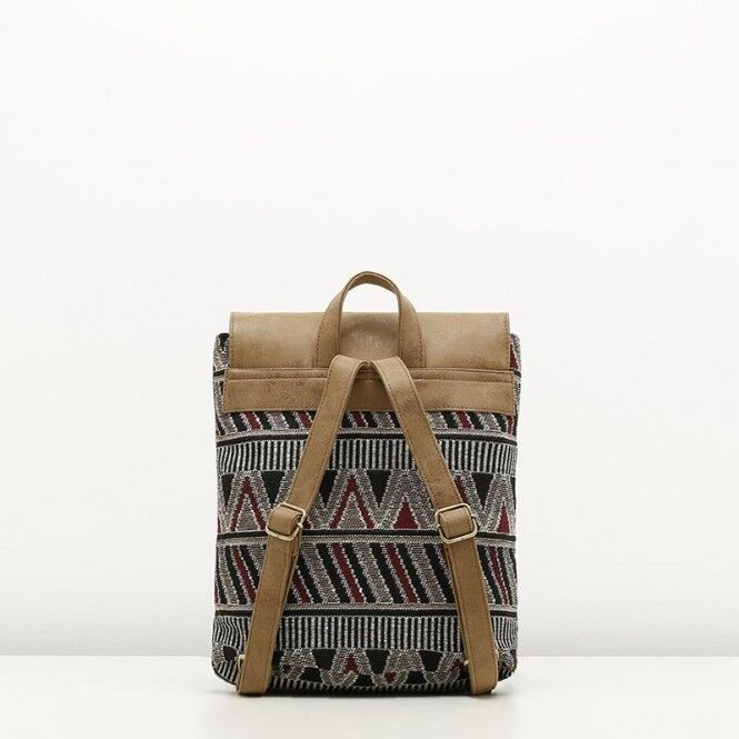 El cuerpo de la mochila está formado por este tejido de jacquard y en la parte superior encontramos la solapa realizada en símil cuero desgastado con tiras con hebillas ornamentales que le dan un aire retro muy bonito.